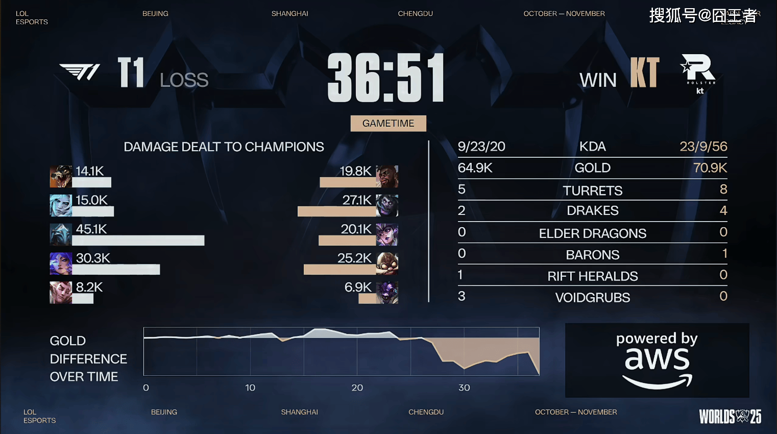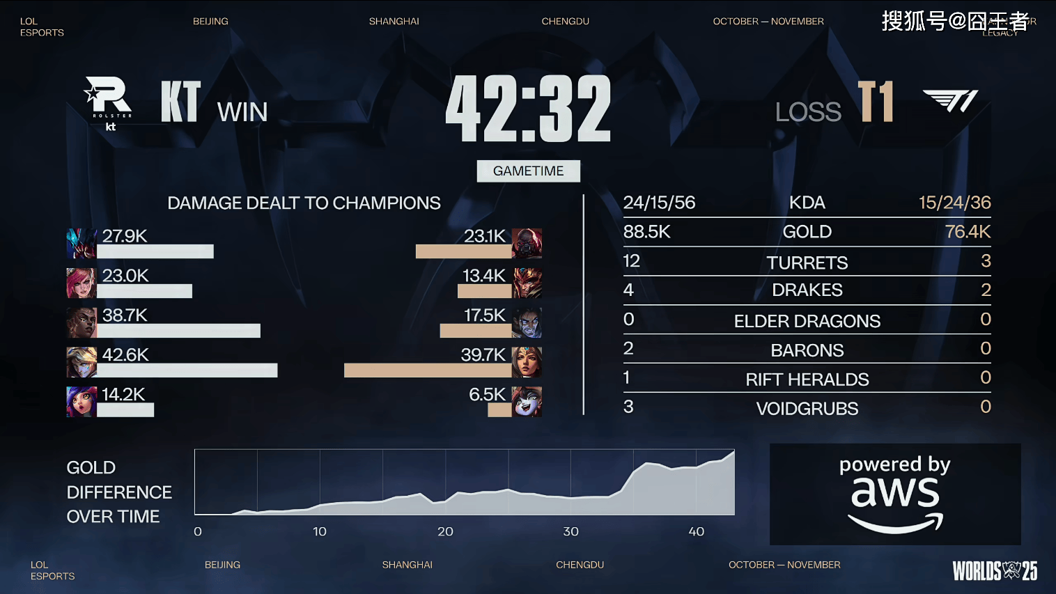 结果决胜局,T1触发了被动-在全球总决赛BO5处于1-2落后时:第五局胜率100%。比赛前期,T1连续抓上得手打出优势。比赛第22分钟,两队爆发厄塔汗团。Gumayusi女枪三杀帮助T1打出1换5团灭KT;比赛第26分钟左右,Oner潘森秒掉炸弹人后T1继续追击,KT反击打出1换2;比赛第29分钟左右,两队爆发小龙团。Gumayusi女枪完美大招帮助T1打出1换4后拿下大龙;最终比赛第36分钟左右,T1先后打出0换5后一波结束比赛。